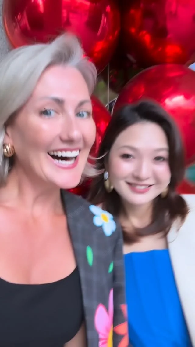 Two women standing together in a room with a red wall decorated with framed art and objects. One woman has short blonde hair, wearing a white jacket, black lace top, and black pants, smiling with hands on her hips. The other woman has shoulder-length dark hair, wearing a cream sleeveless top and gray high-waisted trousers, also smiling with arms crossed.